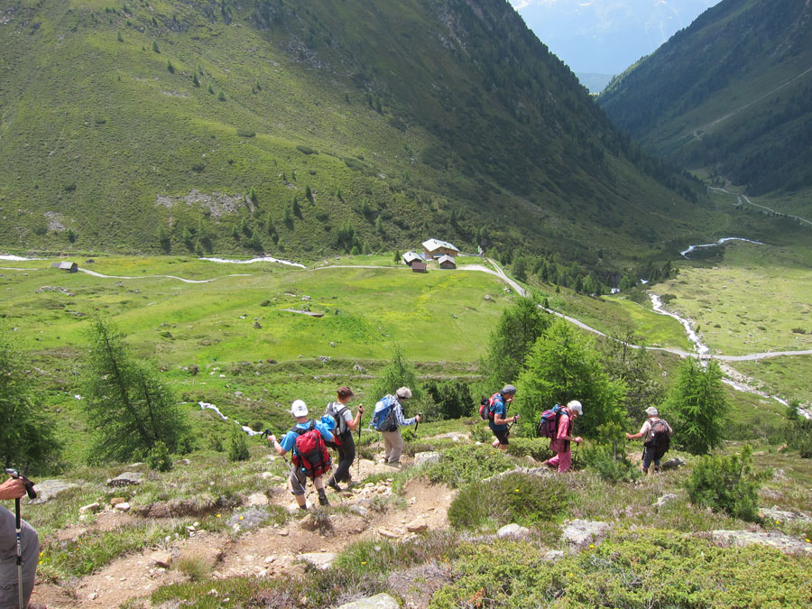 Der hochalpine Standort am Ende des Horlachtales in sonniger Lage auf einem erhöhten Schuttkegel eröffnet einen fantastischen Blick auf die zahlreichen Berggipfel. Für unsere Dreizehnergruppe ist ein gemeinsamer Schlafraum und ein gemütliches Nebenzimmer im Gastraum reserviert. Obwohl der Kaiserschmarrn angesichts der ausgebuchten Hütte nur außerhalb der Hauptessenszeit geordert werden kann, nimmt er bald eine Favoritenstellung ein.