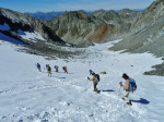 Glockturm 3355 mNach der klaren Nacht beginnt der frühe Aufbruch im Morgennebel, der sich zunehmend lichtet und immer mehr sonnenbeleuchtete Felsen freigibt. Ein schmaler gut angelegter Pfad in fels- und schrofendurchsetzten steilen Grashängen mündet mit einem deutlichen Absatz im Hüttekar, das wie eine riesige Felsarena vor uns liegt, dominiert von Geröll, Moränen und Blockwerk. An der gesamten Nordseite entlang verläuft in dem kesselartigen Gelände der kontinuierlich ansteigende Weg bis zum Hüttekarferner in 2900 m Höhe. Vielfach unterbrochen von Passagen mit Blockgestein, das zu durchsteigen ist. Dann liegt der kleine Gletscher vor uns - Blankeis mit einer feinen Neuschneeauflage. Gepriesen sei der Erfinder der Steigeisen (Oscar Eckenstein). Der Einschnitt im Riffljoch gibt den Blick auf die letzten 200 Höhenmeter in südlicher Richtung zum Gipfel frei. Über einen Blockgrat, durchsetzt von Schuttreißen und einem letzten kurzen knackigen Steilaufschwung ist das Ziel erreicht. Der Ausblick macht atemlos - oder war es der Aufstieg? Kaunergrat, Ötztaler, Lechtaler, Samnaungruppe, Rifflergruppe - alles unter wolkenlosem Himmel. Abstieg wie Aufstieg. Die naviaufgezeichnete Gesamtstrecke: 15 km.Von der unbemerkt vorausgeeilten Co-Begleiterin werden die strahlenden Teilnehmer inclusive Sepp mit einem Prosecco-Empfang überrascht. Zu Ehren des 12fach-Gipfelsieges! Danach gibt es Leo’s Wiener Schnitzel mit Wunschbeilagen - auch 12fach.
