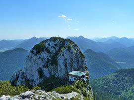 Die Tegernseer Hütte empfiehlt auf ihrer Hompage einen Besuch auch an Regentagen, um die neue Outdoor-Bekleidung zu testen. Die Oberland-Senioren testen den Bayerischen Regenwald bis zum Hochleger Sonnbergalm mit alten Regenschirmen. Ab hier nehmen die tiefhängenden Wolken zwar noch den Blick, aber es regnet nicht mehr. Gut für die südseitige Felspassage am Roßstein, die problemlos überwunden wird. Auf der Zielgeraden zur Hütte graupelt es eiskalt. Der kleine Hüttenraum füllt sich nach und nach mit triefenden jungen Leuten, die offensichtlich alle die Hompage gelesen haben. Die Münchner Hausberge haben auch bei Regen ihren Reiz: Die schöne Aussicht bei gutem Wetter kennt eh jeder.