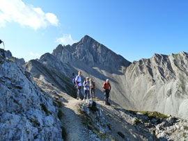 Wird eine Bergtour als Genusstour deklariert, ist nicht der Weg das Ziel, sondern die Bergbahn. Das eher unschöne Skigelände wird in zwei Sektionen mit der Roßhütten-Standseilbahn und einer Gondel bis zum Seefelder Jöchl 2060 m überwunden. Dabei schauen neugierige Gämsen zu. Bereits auf dem Schönangersteig direkt zur Seefelder Spitze 2220 m eröffnen sich herrliche Aus- und Tiefblicke auf die grandiosen Karwendelketten, die dominierende Hohe Munde und das Inntal. Nach einem kurzen Schartenabstieg (100 Hm) windet sich der schmale Weg wieder ansteigend unter den für die Erlspitzgruppe typischen Verwitterungsformen, wie bizarren Türmen und Felsnadeln, durch das Reitherkar hinauf auf das Reither Joch 2197 m. Die Einladung zum Gipfelaufbau findet über eine Leiter statt und mündet in schmale Schotterkehren auf steilem Gras im Wechsel mit seilversicherten Felspassagen. Nach zweihundert Höhenmetern steht die Reitherspitze dem Blick auf die Stubaier nicht mehr im Weg, und gesichtet ist auch die Nördlinger Hütte in bester Einkehr-Lage.