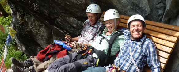 Hippach bei Mayrhofen im Zillertal war unser Talort zum Einstieg in die Klettersteige, die vor einigen Jahren angelegt wurden. Die Steige sind gut miteinander zu kombinieren, weil sie mit einer Höhe von ca. 250 Hm relativ kurz sind. Die Gehzeit liegt bei jedem Steig bei etwa 3 Stunden. Der Huterlahner gilt mit der Bewertung B/C als mittelschwerer Steig mit guten Griffen und Bügeln. Der Clou ist eine kleine Seilbrücke. Es macht Spaß, ihn zu gehen. Schwieriger ist der nächste Steig, die Pfeilspitzwand. Sie ist eine respektable Anlage und für Anfänger nicht geeignet. Die Schwierigkeitsskala geht bis zu ein paar D-Stellen. Diese Stellen verlangen eine Portion Armkraft, und die Tritte und Griffe sind spärlicher vorhanden. Auch erfordern einige ausgesetzte Tiefblicke Mut. Wir konnten uns überzeugen: Die Pfeilspitzwand darf trotz ihrer Kürze auf keinen Fall unterschätzt werden.
