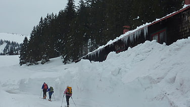 Gut passierbar ist die Straße hinauf nach Innerst auf 1283 m, hoch über Schwaz. Von hier aus steigen wir auf zur Weidener Hütte. Entlang der 7 km langen Rodelbahn, die wegen der vorangegangenen starken Schneefälle zum Rodeln noch nicht geeignet ist, erreichen wir nach zwei Stunden die Hütte. Das schöne Wetter und der fantastische Schnee locken zu einer Nachmittagstour. Wir steigen auf in Richtung Nafingköpfl und fahren ab im Tiefschnee.