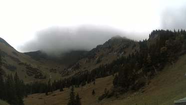 Blick vom Taubensteinhaus auf Kleintiefental-Alm, darüber Miesingsattel, Rotwand, Lämpersberg (v.l.n.r)