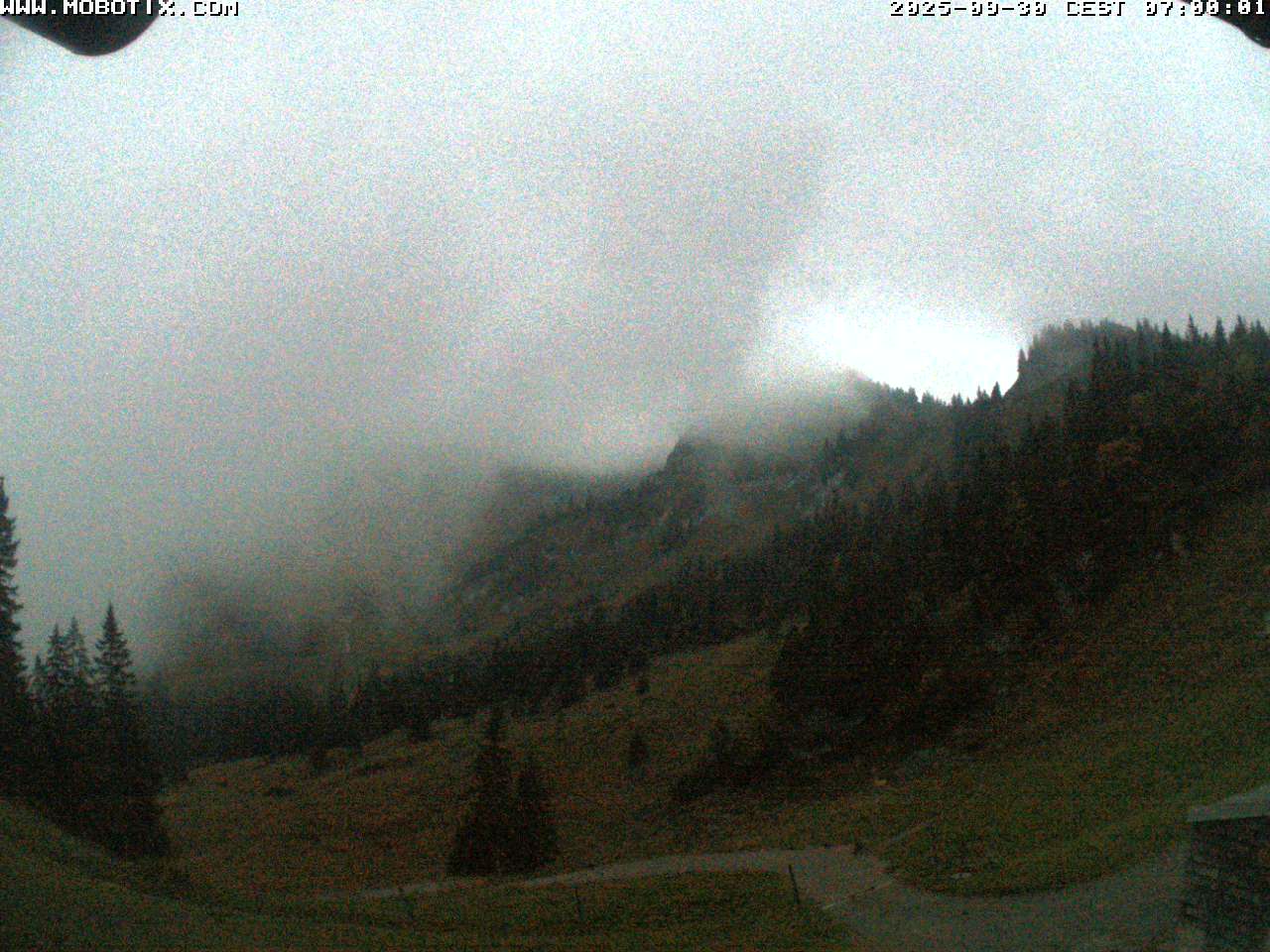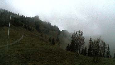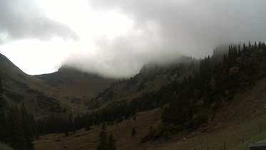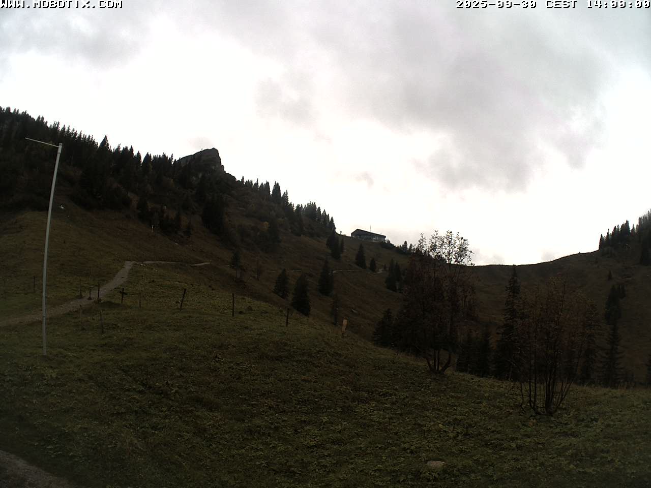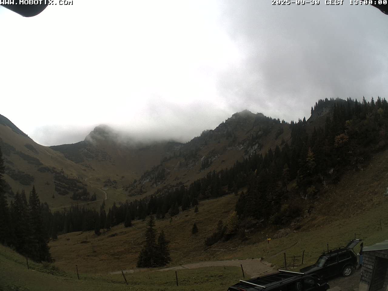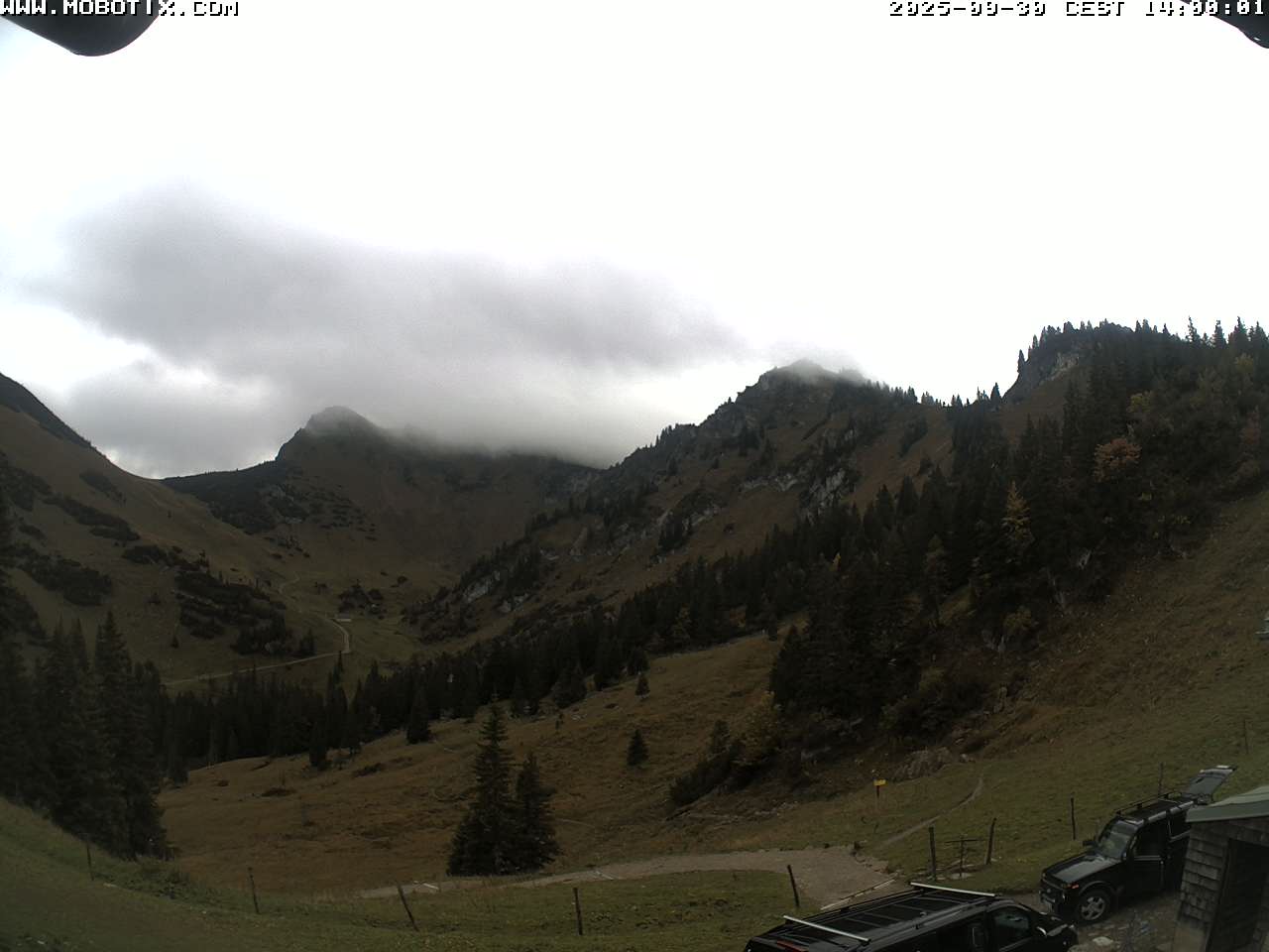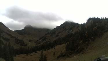 Blick vom Taubensteinhaus auf Kleintiefental-Alm, darüber Miesingsattel, Rotwand, Lämpersberg (v.l.n.r)